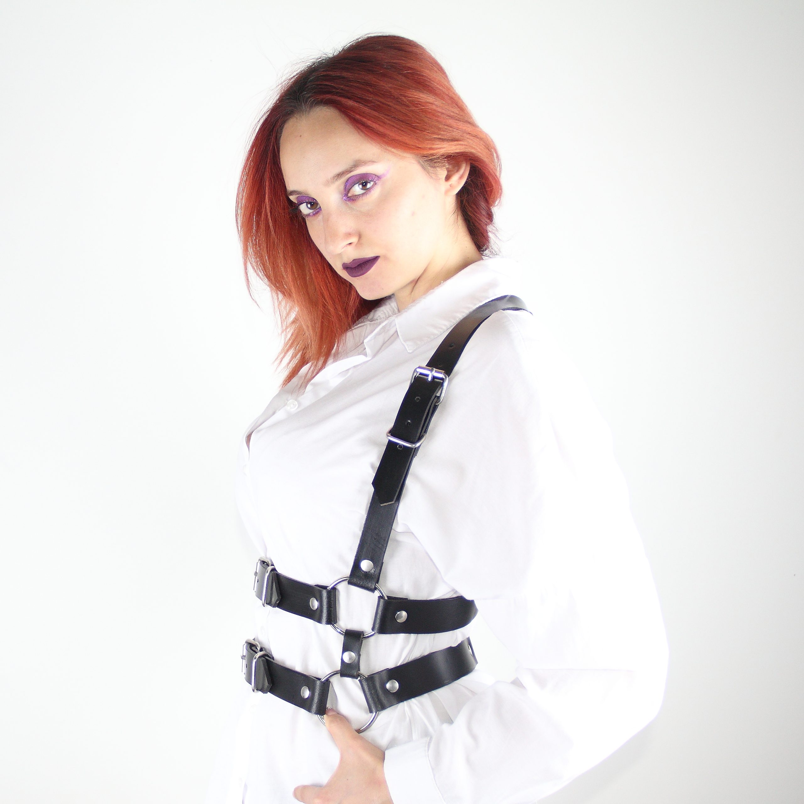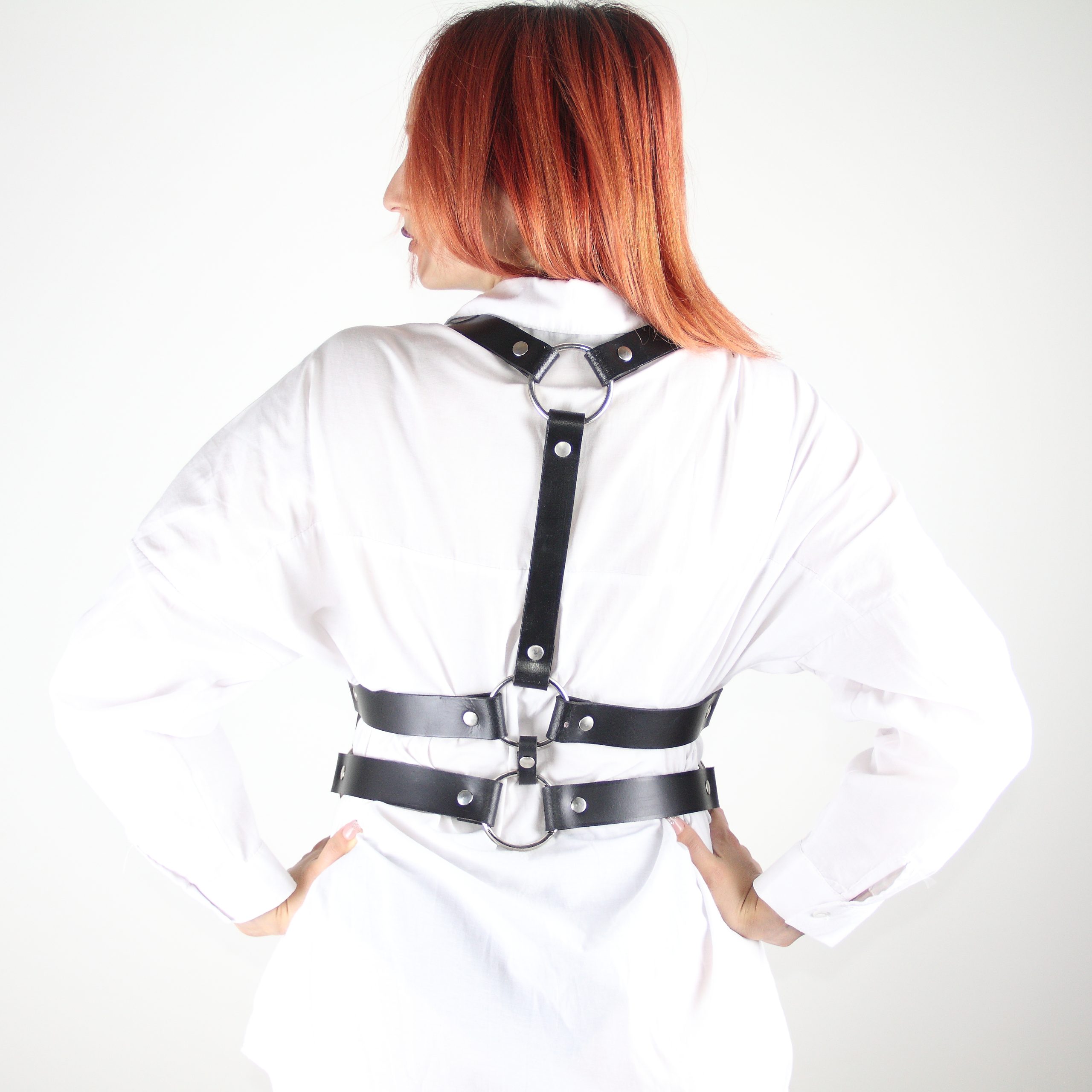 2,5 cm genişliğinde ve 3 mm kalınlığında birinci sınıf hakiki deriden tamamen elde üretilen bu vücut kemeri, omuzdan bele uzanan sade ama güçlü tasarımıyla dikkat çeker. Hem stil sahibi bir görünüm hem de BDSM estetiğini günlük hayata taşıyan bir aksesuardır.